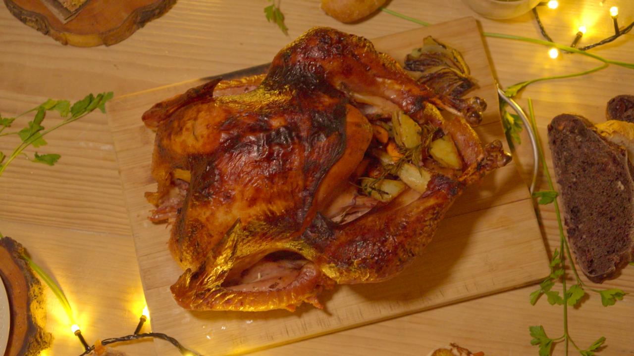 Pavo completo curado 48 h y horneado con mantequilla, vino blanco y romero. Suave, jugoso y con piel dorada.